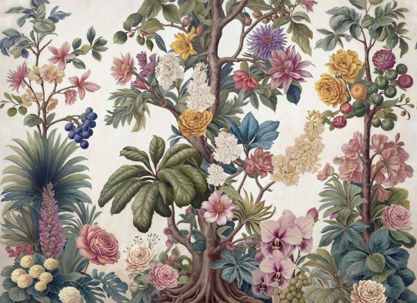 Dit beeld toont een weelderige botanische compositie waarin een sierlijke boom centraal staat, omringd door een overvloed aan bloemen, bloesems, bladeren en vruchten. De illustratieve stijl doet denken aan klassieke botanische prenten, met veel aandacht voor detail, textuur en natuurlijke vormen. Bloemen in zacht roze, poederlila, warm geel en crème worden afgewisseld met rijk groen en blauwgroen blad, wat zorgt voor een harmonieuze en uitgebalanceerde uitstraling.