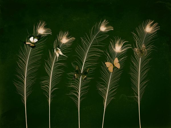 Vlinders op pauwenveren en een mooi donker groene achtergrond.