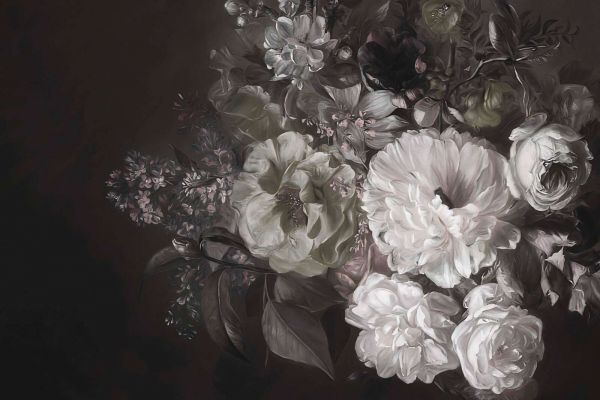 Om de romantische en vintage uitstraling te versterken, kunnen accessoires in antiek goud, messing of donker hout worden toegevoegd. Warme verlichting, zoals kaarslicht of gedempte wandlampen, zal de rijke kleuren nog meer tot leven brengen en de dramatische achtergrond accentueren. Dit ontwerp is een tijdloze ode aan de schoonheid van bloemen en brengt een unieke combinatie van nostalgie, luxe en verfijning in elke ruimte.