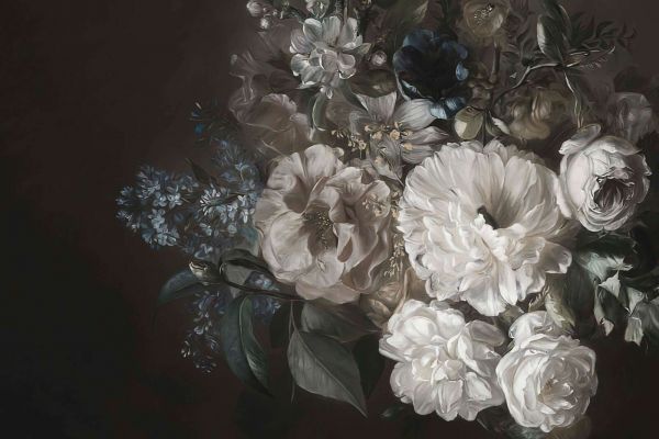 Dit weelderige ontwerp brengt de klassieke schoonheid van een bloemstilleven tot leven. De verfijnde rozen, pioenrozen en bloesems in zachte crème- en aardetinten contrasteren prachtig met de donkere achtergrond, terwijl subtiele accenten van blauw en groen een extra dimensie aan het geheel geven. De gedetailleerde penseelstreken en realistische texturen creëren een sfeer die doet denken aan de schilderkunst uit de barokperiode, waarin bloemen werden vereeuwigd als symbolen van vergankelijkheid en elegantie.