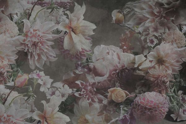 Dit verfijnde ontwerp brengt de charme van een herfstige bloementuin tot leven. Met een intrigerende mix van dahlia’s, rozen en physalis creëert het een rijke en warme sfeer. De kleuren variëren van zacht crème en pastelroze tot diepere tonen van okergeel en paars. De donker getinte achtergrond versterkt de bloemenpracht en geeft het geheel een dramatische en tijdloze uitstraling. De textuur doet denken aan een verweerd schilderij, wat een artistieke en nostalgische touch toevoegt.