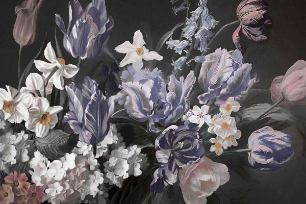 Een elegant en klassiek bloemstilleven met statige tulpen, narcissen en bloesems in rijke blauw-, lila- en crèmetinten. De donkere achtergrond versterkt het dramatische contrast en geeft het ontwerp een tijdloze en verfijnde uitstraling. Perfect voor een luxueus en artistiek interieur.