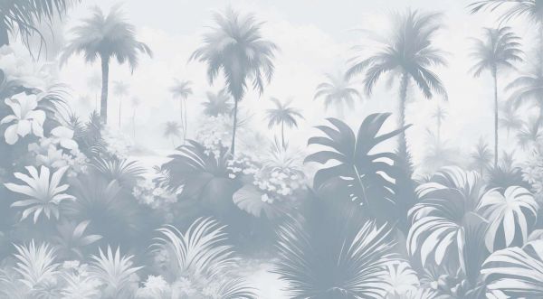 Een verfijnd tropisch landschap in zachte blauwgrijze tinten, met sierlijke palmbomen en weelderige exotische planten. De subtiele mist en koele pasteltinten creëren een serene en ontspannende sfeer, perfect voor een kalme en stijlvolle ambiance in elk interieur.