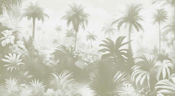 Een rustgevend tropisch landschap in zachte groentinten, met sierlijke palmbomen en weelderige exotische planten. De nevelige sfeer en subtiele pastelkleurige nuances zorgen voor een harmonieuze en natuurlijke uitstraling, perfect voor een kalme en evenwichtige ambiance in elk interieur.