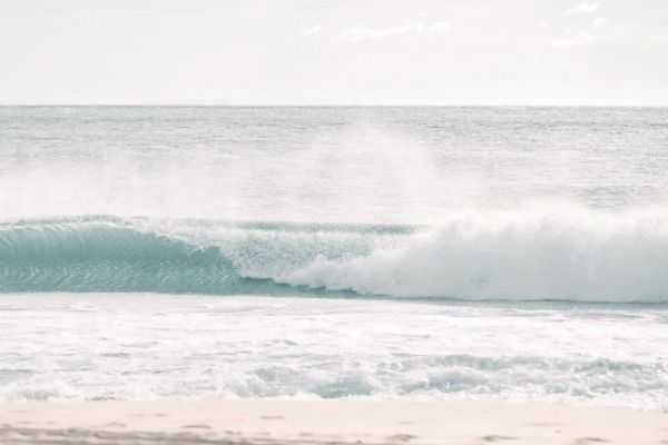 Deze lichte en luchtige compositie toont een enkel moment van natuurlijke beweging: een golf die zich opbouwt en breekt aan de rand van een zonovergoten strand. Het water is kristalhelder en kleurt in tinten van zacht turquoise, blauwgroen en wit schuim. De achtergrond is minimalistisch – enkel zee, lucht en licht – wat het beeld een ruimtelijk en kalmerend karakter geeft.