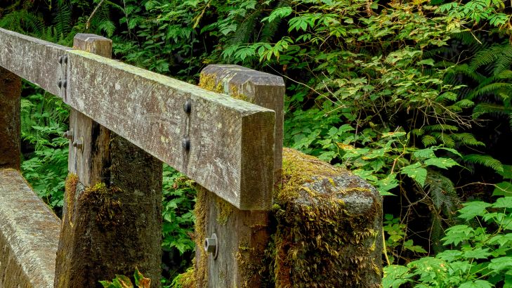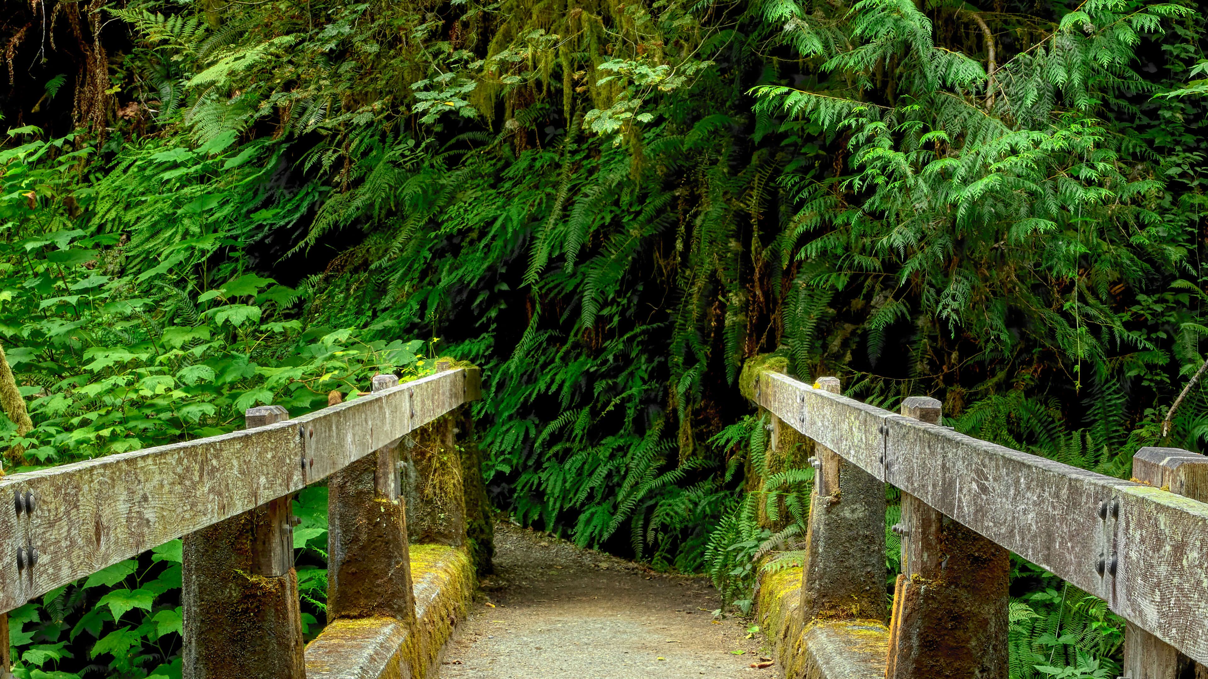 Houten brug midden in een felgroen gekleurd bos