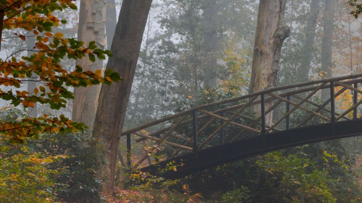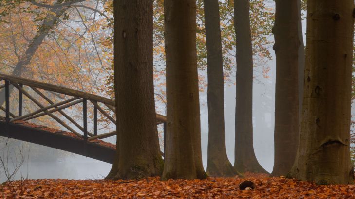 Bruggetje in het herfstbos op fotobehang. Met dit behang breng je de mooie herfstkleuren in huis.