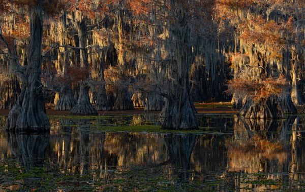 Fotobehang van het Caddo lake. In de reflectie zie je de bomen die in het meer staan.