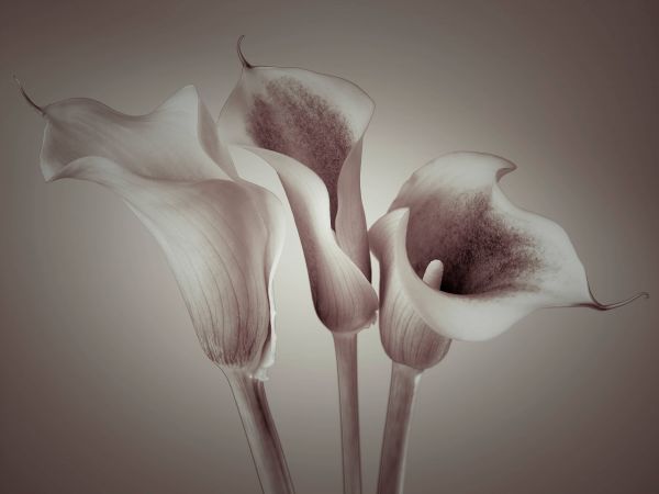 Een close-up van drie witte calla lelie's. Combineer dit fotobehang in huis voor nog meer sfeer.