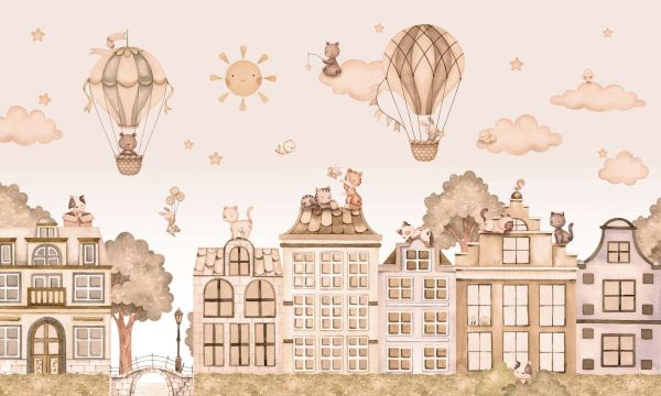 Deze charmante illustratie toont een fantasierijk stadslandschap met sierlijke huisjes in verschillende vormen en hoogtes. Op de daken spelen schattige diertjes zoals katjes, beertjes en konijntjes, terwijl boven de stad luchtballonnen rustig door de lucht zweven. Kleine wolkjes, sterretjes en een vriendelijk zonnetje zorgen voor een speels en sprookjesachtig gevoel. Het kleurgebruik bestaat uit warme aardetinten zoals beige, zand en lichtbruin, aangevuld met subtiele accenten van zacht groen en perzik. Hierdoor ontstaat een knusse en uitnodigende sfeer met een rustige, harmonieuze uitstraling.