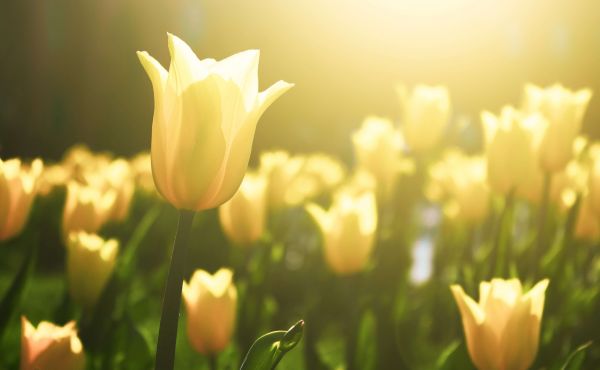 Close-up van een geel tulpenveld met een onscherpe achtergrond