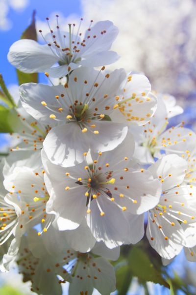 Een close-up afbeelding van witte Japanse bloesems met groene blaadjes.