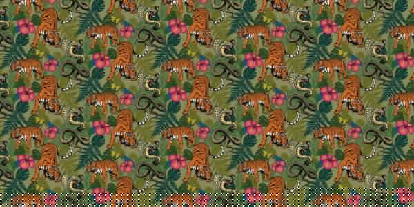 Een patroon van cobra's en tijgers met bloemen, bladeren en vlinders op een groene achtergrond.