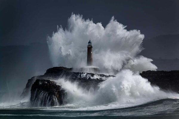 Comb op fotobehang. Een spectaculair beeld van water hoog boven een vuurtoren uitkomt.