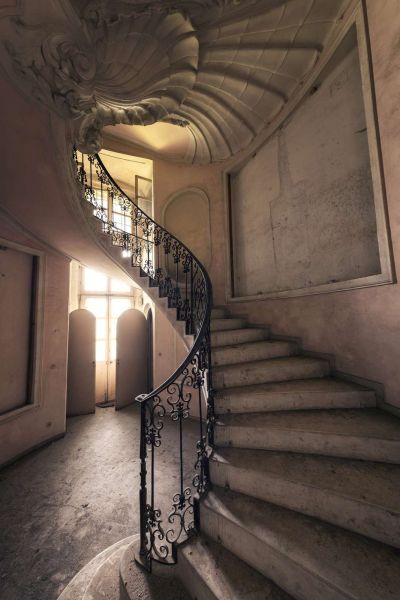 De prachtige trap van een prachtige en enorme villa ergens in Italië. De schelp bovenaan de trap gaf het gebouw zijn naam in de Urbex-scèn.