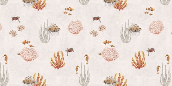 Een rustgevend onderwaterpatroon met kleurrijke koraalriffen, tropische vissen, zeepaardjes en schildpadden. De zachte bruine achtergrond en gedetailleerde illustraties creëren een serene maritieme sfeer, perfect voor het toevoegen van een ontspannen en exotisch accent aan elke ruimte.