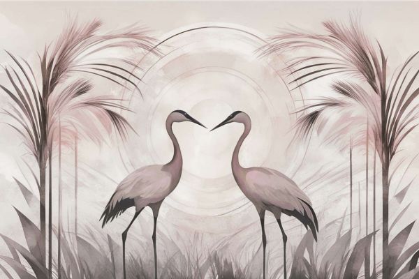 De gracieuze schoonheid van twee kraanvogels komt samen in een betoverend tafereel vol zachtheid en balans. Hun slanke vormen en sierlijke halzen vormen een harmonieus geheel, omlijst door wuivende tropische bladeren en een subtiele, abstracte zon op de achtergrond. De kleuren bestaan uit zachte pasteltinten, variërend van warm beige tot vergrijsd roze, wat zorgt voor een verfijnde en rustgevende sfeer.