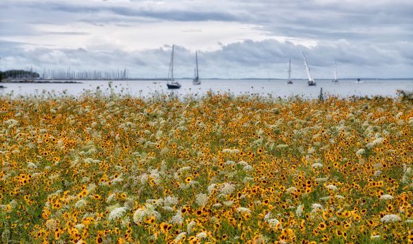 Een veld met paardenbloemen, op de achtergrond kan je zeilboten zien varen.