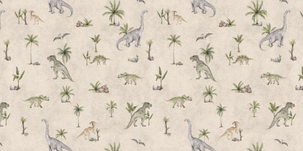 Een avontuurlijk patroon vol dinosaurussen, zoals de T-Rex en stegosaurus, tussen prehistorische planten en landschappen. De lichte achtergrond en zachte illustraties brengen een speelse, nostalgische sfeer die perfect is voor het toevoegen van een fantasierijk accent aan elke ruimte.