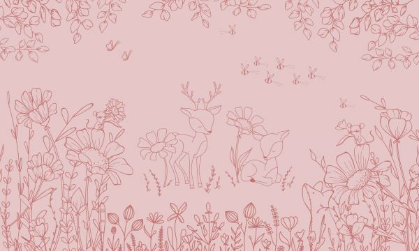 Deze elegante illustratie toont een rustig natuurtafereel waarin twee hertjes zich bevinden tussen hoge bloemen, ranke planten en kleine bosdiertjes. Vlinders en bijtjes zweven speels door de lucht, terwijl de botanische details zorgen voor een levendig maar subtiel geheel. De illustratiestijl bestaat uit fijne lijntekeningen in een warme rozetint op een zachte roze achtergrond. Deze ton-sur-ton kleurstijl creëert een harmonieus en vriendelijk beeld met een romantisch en verfijnd karakter.