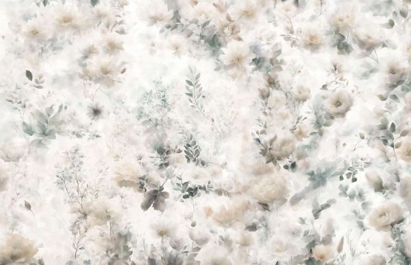 Een romantische compositie van zachte bloemen in pastelkleuren zoals roze, crème en groen. De delicate penseelstreken creëren een serene en dromerige sfeer, perfect voor het oproepen van een gevoel van rust en elegantie.