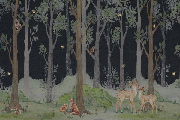 De dieren van het bos midden in de nacht. De vuurvliegjes geven een beetje licht zodat je de dieren wel kunt zien.
