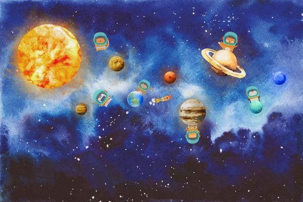 Een afbeelding van getekende ruimtedieren in waterverf.