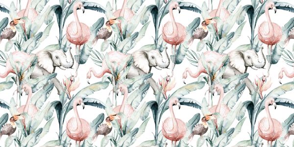 Een patroon met flamingo's, een olifant en een vogel tussen tropische bladeren.