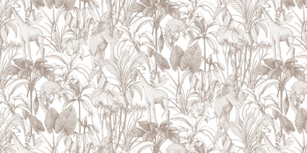 Dieren tussen de palmbomen in taupe. In dit patroon vind je konijnen, panters en olifanten en giraffen met vlinder vleugels.