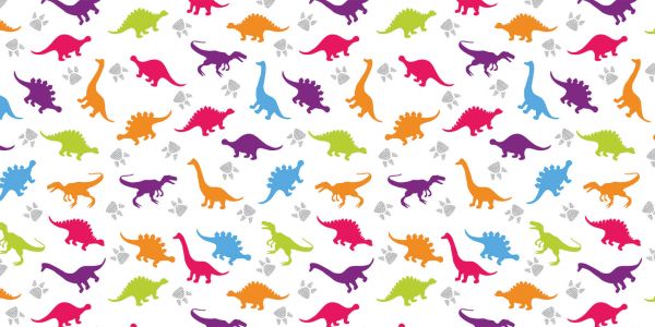 Wandkleed van gekleurde dinosaurussen en pootafdrukken op een witte achtergrond