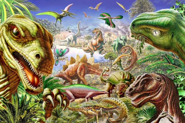 Dit kleurrijke ontwerp neemt je mee naar een prehistorische wereld waarin dinosauriërs in al hun glorie te zien zijn. Met een rijke verscheidenheid aan soorten, van de imposante T-Rex tot de majestueuze brontosaurus en de stekelige stegosaurus, straalt dit ontwerp een gevoel van avontuur en ontdekking uit. De weelderige jungle en het serene water op de achtergrond, in combinatie met felle groene, bruine en blauwe tinten, geven het geheel een levendig en dynamisch karakter.