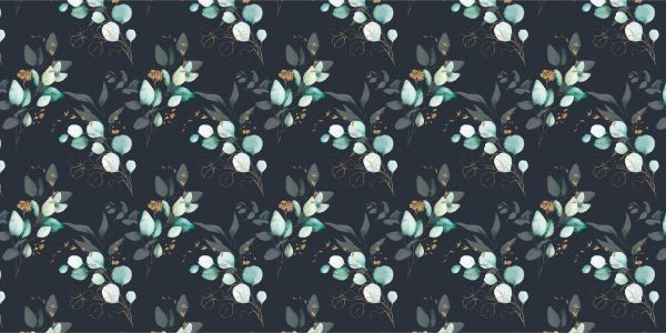 Donkerblauw behang patroon met groene bladeren. Tussen de bladeren zitten mooie gouden accenten.
