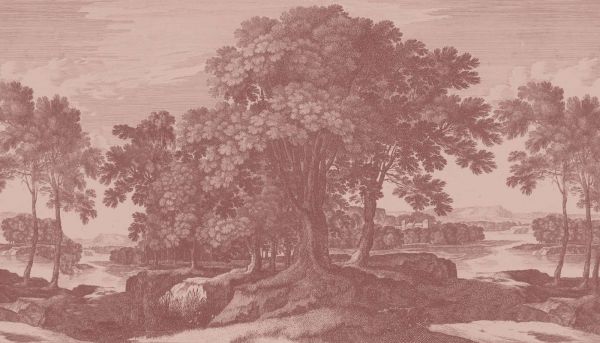 Dit ontwerp straalt de tijdloze charme van een klassiek landschap uit, met imposante bomen die symbool staan voor kracht en stabiliteit. De zachte beige kleuren zorgen voor een subtiele en serene uitstraling, terwijl de fijne details van de bomen en de rivier een gevoel van diepte en beweging creëren. Het lichte reliëfeffect geeft het ontwerp een vintage karakter dat doet denken aan oude etsen of gravures, ideaal voor liefhebbers van kunsthistorische schoonheid.