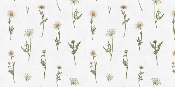 Een elegant patroon met delicate margrietjes en wilde bloemen, verspreid over een witte achtergrond. De gedetailleerde illustraties en zachte kleuren brengen een frisse en natuurlijke uitstraling, ideaal voor het toevoegen van een subtiel en tijdloos accent aan elke ruimte.
