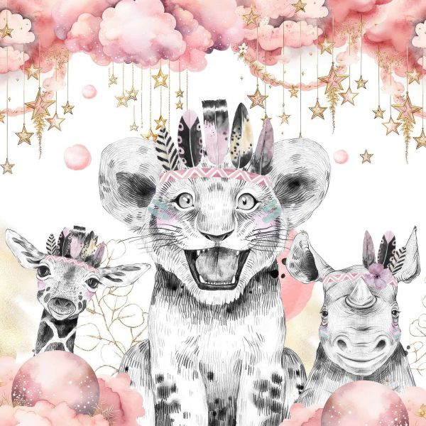 Een speelse leeuwenwelp, een nieuwsgierige giraffe en een vrolijke neushoorn staan samen onder een magische hemel vol roze wolken en fonkelende sterren. De combinatie van zwart-witte illustraties met zachte pasteltinten en gouden accenten geeft dit ontwerp een dromerige en fantasierijke uitstraling.
