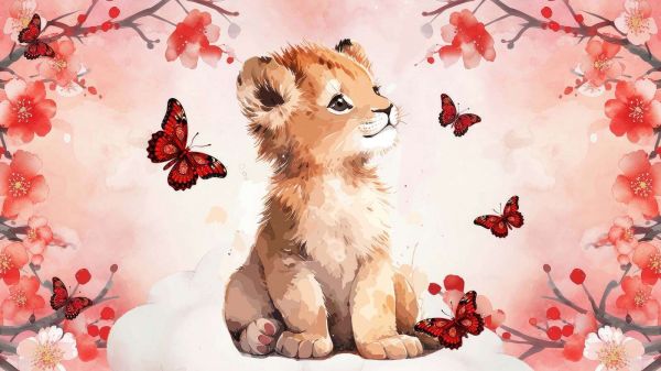 Een schattige leeuwenwelp kijkt dromerig naar sierlijke rode vlinders die om hem heen fladderen. Omringd door bloeiende takken en een warme aquarelachtergrond in zachte rood- en perziktinten straalt dit ontwerp speelsheid en elegantie uit.