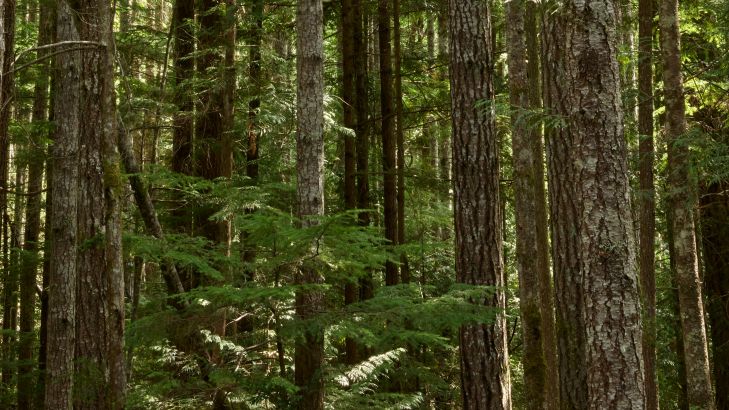 Een mooi groen sparrenbos waarbij lichte zonnestralen tussen de bomen doorvallen.