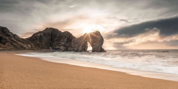 Als een schilderij waar de natuur de penseelstreken bepaalt, biedt dit tafereel een blik op de majesteit van de kust. De rotsboog fungeert als een natuurlijke poort waardoor de laatste stralen van de zon de dansende golven verlichten. Het is een moment van rust en kracht, vastgelegd in een wereld die constant in beweging is.