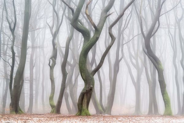 Een mistig en dromerig bos met kronkelende bomen in het najaar.