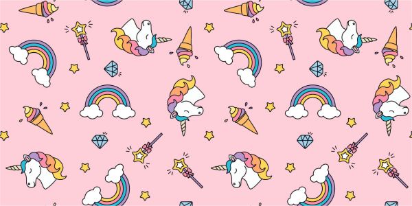 Behang met patroon van kleurrijke eenhoorns, regenbogen en ijsjes op een roze achtergrond.