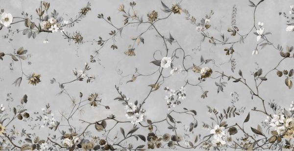 Sierlijke takken met fijne bloesems en subtiele bessen strekken zich uit over een zachte grijsgrauwe achtergrond. De warme sepia- en zandtinten geven het geheel een rustige, verfijnde uitstraling met een bijna klassieke, handgetekende charme.