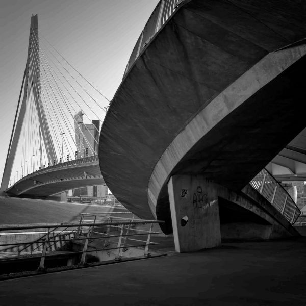 Een krachtig zwart-wit beeld waarin de iconische Erasmusbrug en een moderne voetgangersbrug elkaar in dynamische lijnen ontmoeten. De strakke kabels, gebogen betonstructuren en speelse schaduwen creëren een abstract en architectonisch sterk contrast. Dit perspectief benadrukt de grootsheid en elegantie van Rotterdamse infrastructuur.