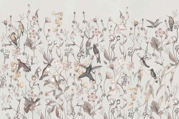 Een levendig ontwerp met delicate bloemen en sierlijke kolibries, harmonieus verweven in een luchtige compositie. Dit patroon ademt een verfijnde natuurlijke charme en brengt een frisse, lenteachtige sfeer in elke ruimte.