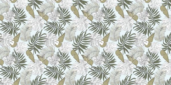 Een patroon van monstera en palmbladeren op een lichtblauwe achtergrond.