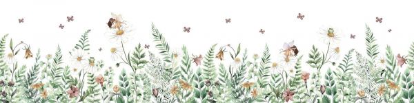 Deze betoverende illustratie toont een zomers bloemenveld vol frisgroene varens, witte madeliefjes, sierlijke klokbloemen en pastelgetinte wilde bloemen. Tussen het groen zitten kleine elfjes verstopt, zittend op bloemblaadjes of dromend tussen de stelen. Rondom hen dansen vlinders in zachte bruinroze tinten, wat het geheel een sprookjesachtige lichtheid geeft.
