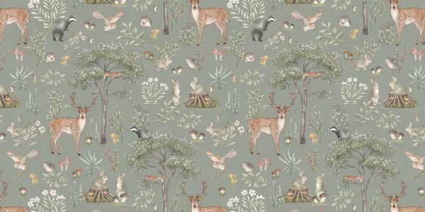 Een magisch bospatroon met gedetailleerde dieren zoals herten, konijnen, dassen en uilen, omlijst door bomen, struiken en paddenstoelen. De vintage achtergrondkleur creëert een sprookjesachtige, serene sfeer, ideaal voor het toevoegen van een betoverend accent in elke ruimte.