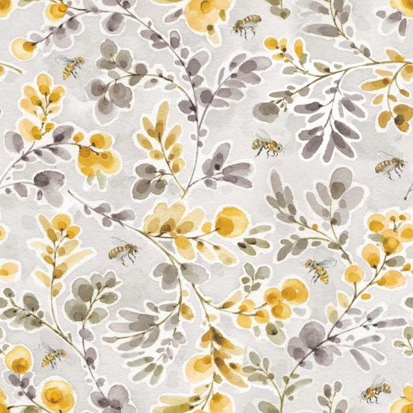 Een zacht aquarelpatroon met dansende bijen tussen gele bloesemtakken en grijsgroene bladeren. De kleuren zijn harmonieus en rustgevend, met warme okergele tinten en subtiele grijstinten.