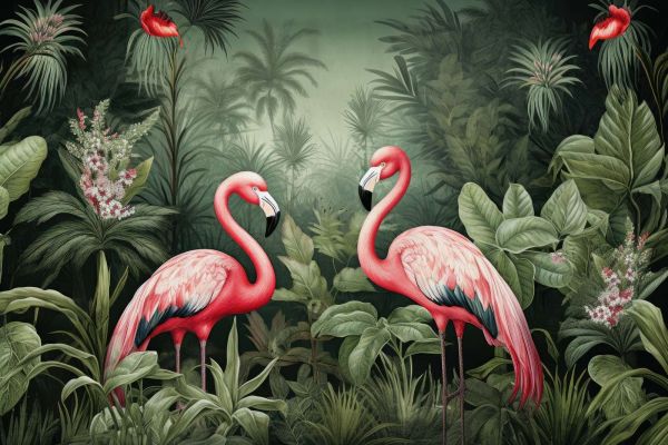 Twee sierlijke flamingo's staan tussen een rijkdom aan tropische vegetatie, hun roze veren een opvallende contrast tegen de diepgroene achtergrond. Het tafereel ademt een atmosfeer van serene schoonheid, waarin elk element bijdraagt aan een gevoel van rust en natuurlijke harmonie.