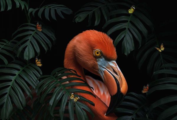 Deze betoverende compositie vangt de elegantie van een feloranje flamingo die deels verscholen zit tussen weelderige tropische bladeren. Het geheel wordt subtiel verrijkt met vlinders in warme tinten geel en oranje, die het beeld een extra speelse en levendige dimensie geven. De donkere achtergrond zorgt voor een sterk contrast en laat de kleuren echt tot leven komen, waardoor het geheel een mysterieus maar uitnodigend karakter krijgt.