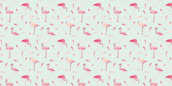Mintgroen behang met een patroon van roze flamingo's en veren.